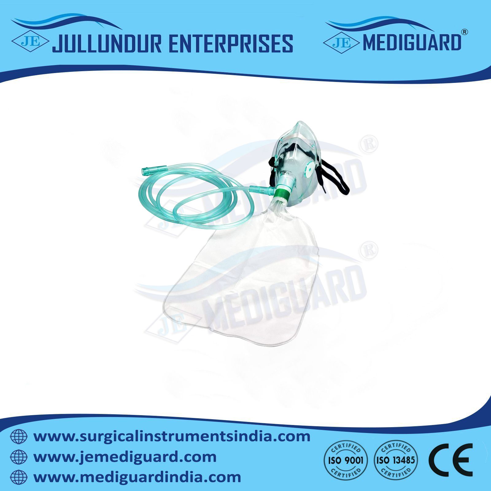 JULLUNDUR ENTERPRISES / JALANDHAR ENTERPRISES SURGICAL INDUSTRIES is engaged in manufacturing, supplying & exporting OXYGEN MASK WITH RESERVOIR BAG.